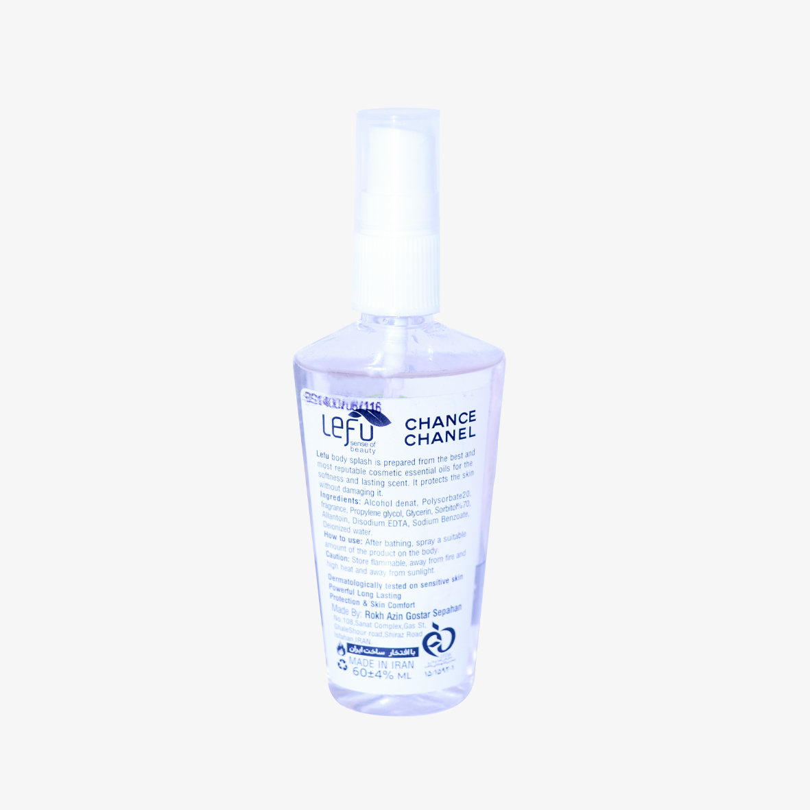 اسپری خوشبو کننده بدن لفو با رایحه CHANEL CHANCE حاوی اسانس ادکلن اصلی با گرید بهداشتی تحت لیسانس شرکت اصلی در ایران تولید می شود که با داشتن عصاره آلورا و دکسپنتول باعث نرمی و شادابی پوست شما می گردد همچنین رایحه خوش این بادی اسپلش 24 ساعت بر روی بدون شما مانده و لکی بر لباس شما ایجاد نخواهد کرد.