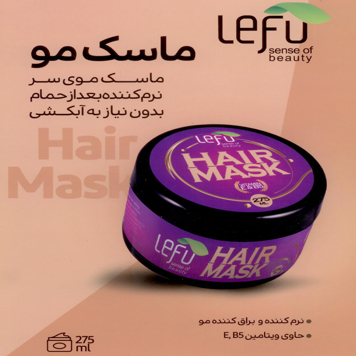 ماسک موی سر لفو حاوی ویتامین های B5 و E و همچنین دارای خاصیت نرم کننده و براق کننده موی سر ، بدون نیاز به آبکشی بعد از مصرف می باشد . یکی از قابلیت های منحصر به فرد این ماسک نرم کنندگی موی سر بعد از حمام می باشد .