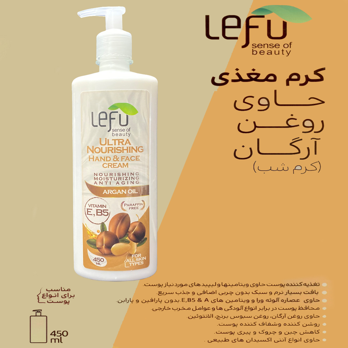 کرم مغذی لفو مناسب برای دست و صورت می باشد ، همچنین این کرم حاوی روغن آرگان است که برای بازسازی و شفافیت پوست مناسب می باشد