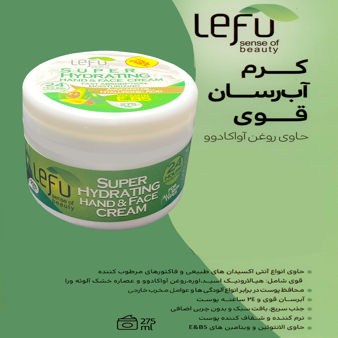 کرم آبرسان خیلی قوی و مرطوب کننده دست و صورت مناسب برای انواع پوست و همچینی حاوی روغن آواکادو و هیالورونیک اسید می باشد .