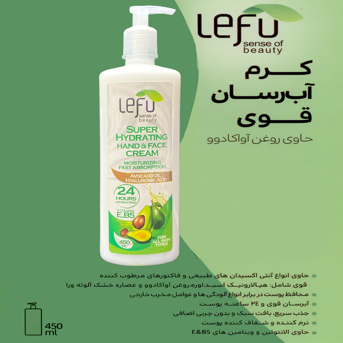 کرم آبرسان خیلی قوی و مرطوب کننده دست و صورت مناسب برای انواع پوست و همچینی حاوی روغن آواکادو و هیالورونیک اسید دارای ویژگی های زیر :