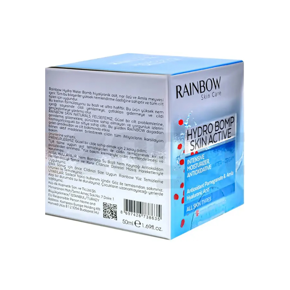 ژل آبرسان کاسه ای رینبو مدل هیدرو بمب یکی از بهترین مرطوب کننده و آبرسان های خارجی می باشد دارای ترکیبات اسید هیالورونیک و مواد هیدراته کننده با خاصیت آبرسانی به سلول های پوستی، ضد پیری و ضد چروک بوده و سرعت قابل توجهی در زمینه از بین بردن خشکی پوست و بازگرداندن شادابی پوست دارد. علی رغم بافت سبکی که این واتر ژل دارد؛ اما تا 24 ساعت آبرسانی پوست را تامین میکند و همین باعث شده است که بسیاری از خانم ها از آن به عنوان زیرساز در آرایش خود استفاده کنند.
