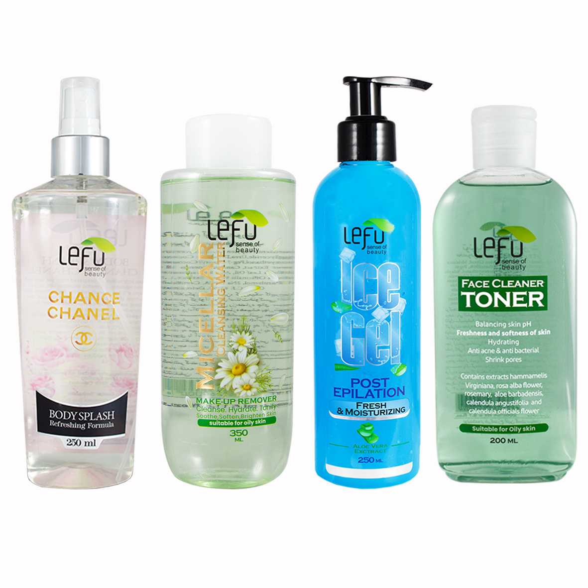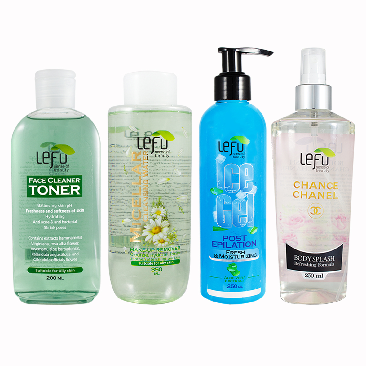 مجموعه مراقبت از پوست لفو مدل هدیه شامل محصولات زیر می باشد : یک عدد پاک کننده آرایش ویژه پوست های چرب حجم ۳۵۰ میلی لیتر یک عدد تونر ویژه پوست های چرب حجم ۲۰ میلی لیتر یک عدد ژل بعد از اپیلاسیون مدل ice و آلوورا حجم ۲۵۰ میلی لیتر یک عدد بادی اسپلش مدل چنل و چنس حجم ۲۵۰ میلی لیتر