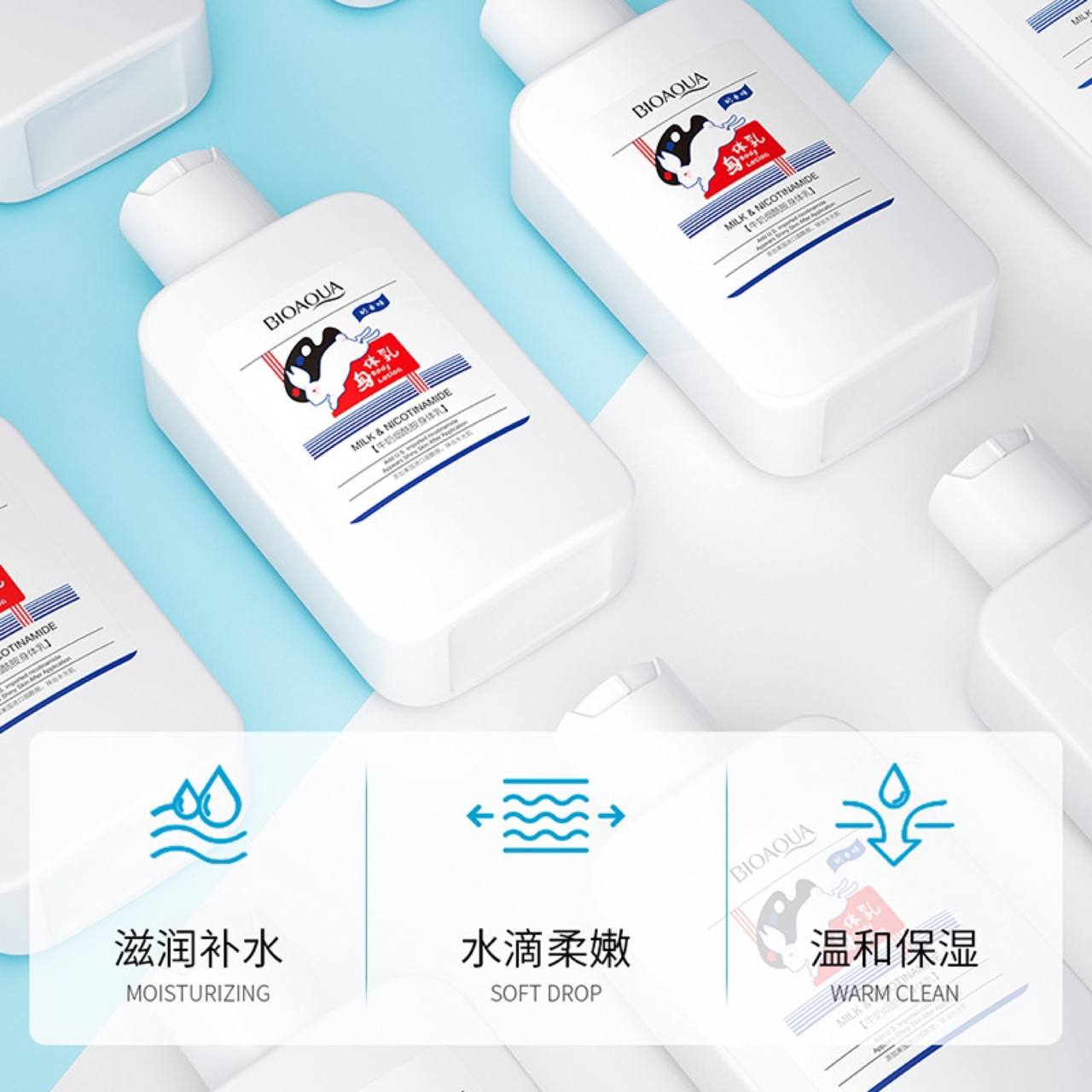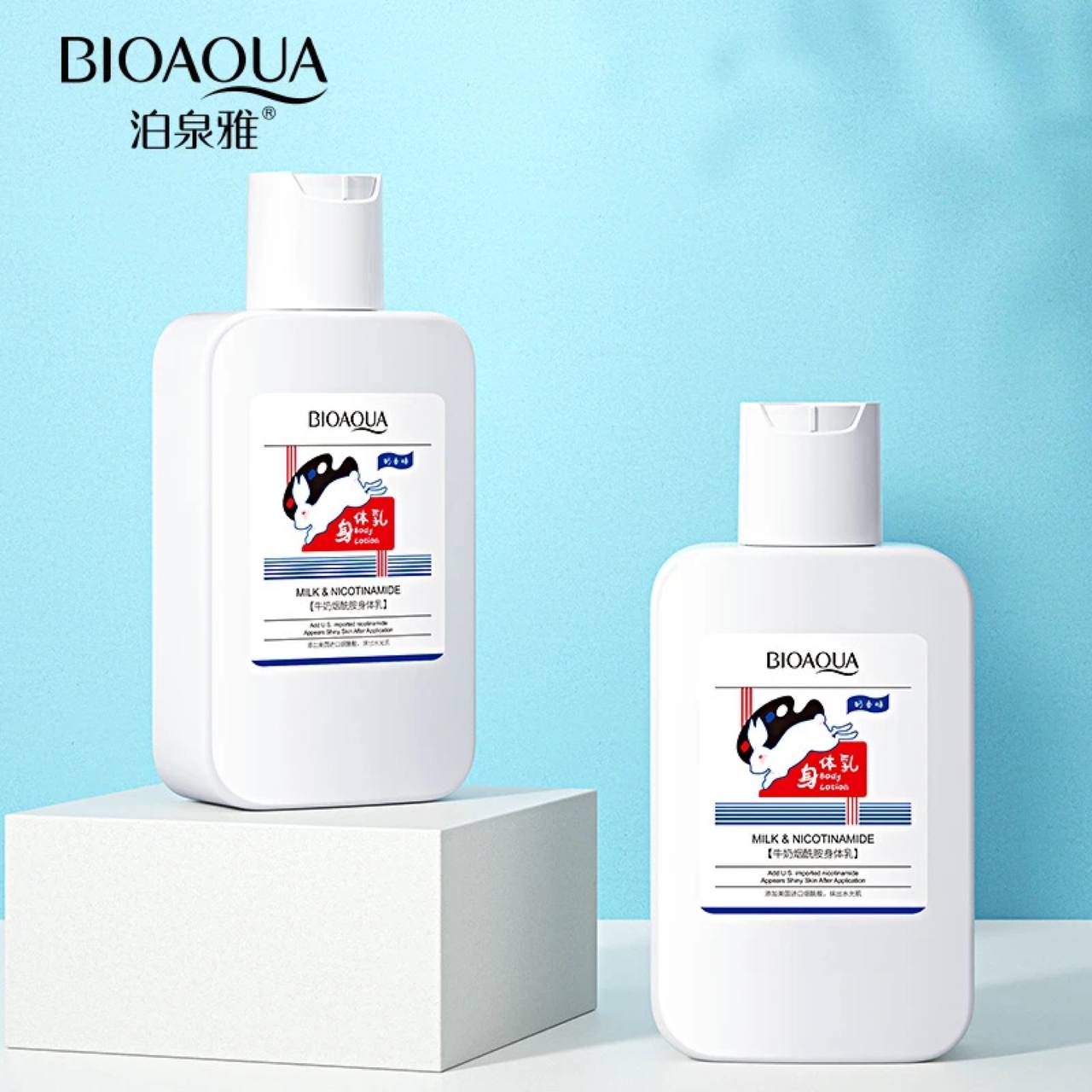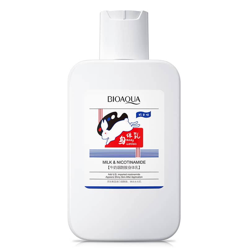 لوسیون بدن روشن کننده شیر و نیکوتین بیوآکوا حاوی عصاره شیر خرگوش و نیکوتین آمید بافتی نرم و سبم با شاین ریزی دارد که بعد از استفاده از آن پوستی نرم و صاف را به شما ارائه میدهد. عصاره شیر با تأمین مواد مغذی مورد نیاز پوست و خاصیت روشن کنندگی بهمراه ترکیب نیکوتین آمید بخوبی پوست را روشن کرده و خشکی و زبری پوست را از بین میبرد.