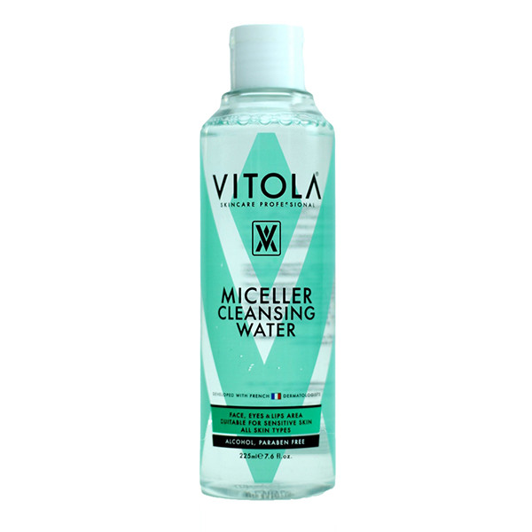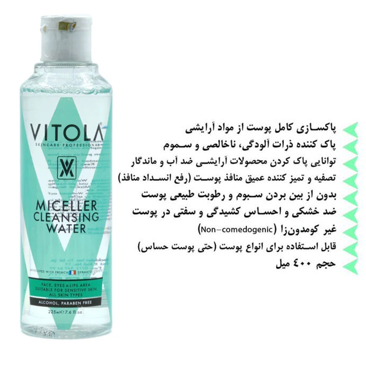 اين ميسلار واتر در واقع ، پاك كننده عمیق و سم زدای پوست، پاک کننده ی انواع آرایش، آبرسان و نرم کننده ی مناسب برای پوست شماست.در این محصول از الکل استفاده نگردیده است و حساسیت خاصی را ایجاد نمی کند. این میسلار قوی آرایش ضد آب را از بین می برد. روغن ها و چربی های موجود در منافذ را پاک سازی می کند.پاک کننده میسلار واتر ويتولا علاوه بر پاک سازی آرایش پوستی شفاف و لطيف را به شما هدیه می دهد. در فرمولاسیون این محصول هیچ ماده سختی مانند آب (سخت)، صابون و روغن وجود ندارد و پس از استفاده نیازی به شستشوی صورت نیست.